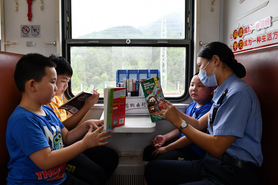 开学前夕,汉中车务段汉中火车站休班职工在8361/8362次列车上,为小旅客讲授“安全第一课”。(8月22日摄)