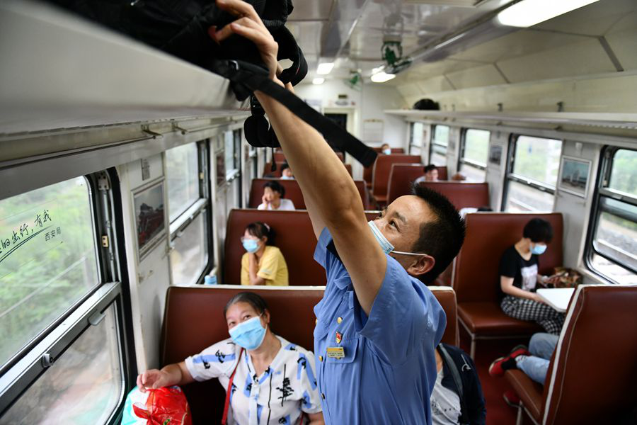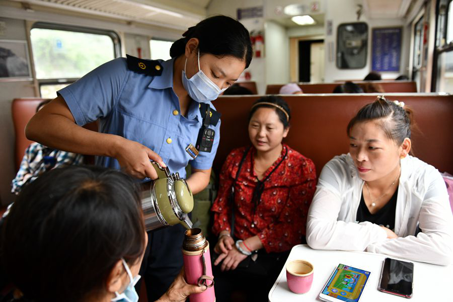 列车上没有锅炉间,饮用热水需要乘务人员从汉中、阳平关车站进行补给。图为乘务员为旅客添开水。(8月22日摄)