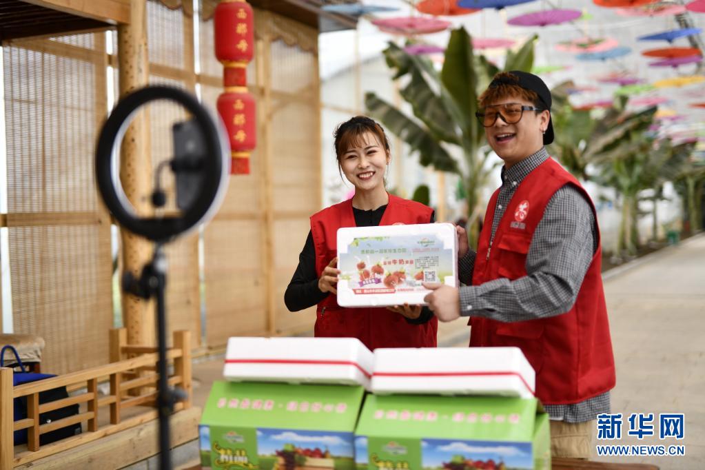 5月11日,工作人员在河北省唐山市丰润区西那母生态旅游度假村内通过网络直播的形式推介草莓。新华社记者 牟宇 摄