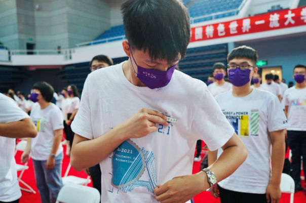 典礼上举行了新生佩戴清华大学徽章仪式,清华大学党委书记陈旭为新生代表戴上了清华大学徽章。佩戴上这枚珍贵的徽章,他们便从此与这座园子和这里的精神血脉相连。