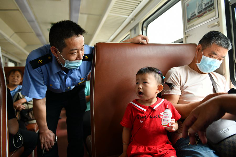 8月22日,在从阳平关返回汉中的8362次列车上,列车长修宝成与小旅客交流。