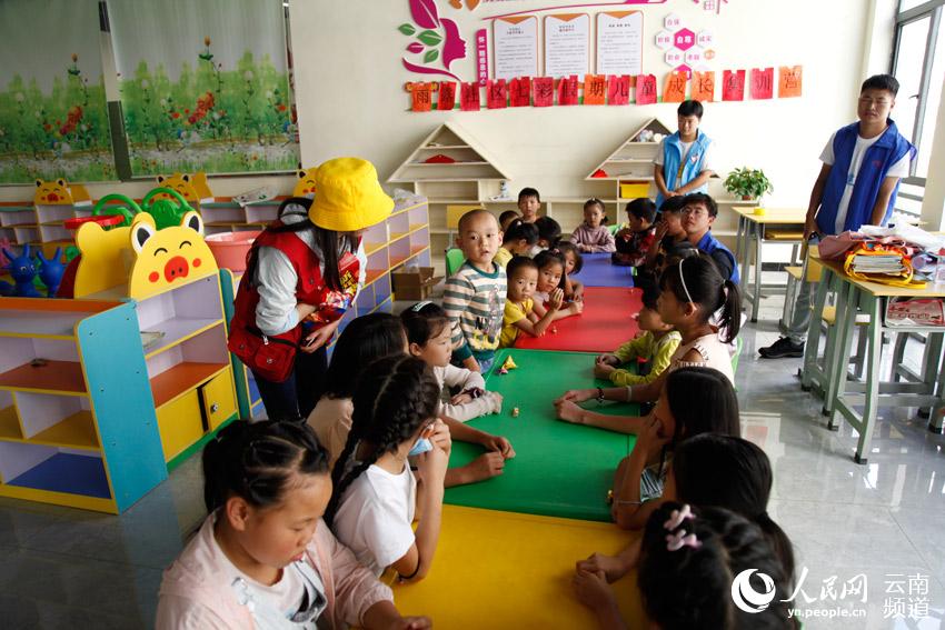 鲁甸县卯家湾安置区,志愿者正与孩子互动。人民网 李发兴 摄