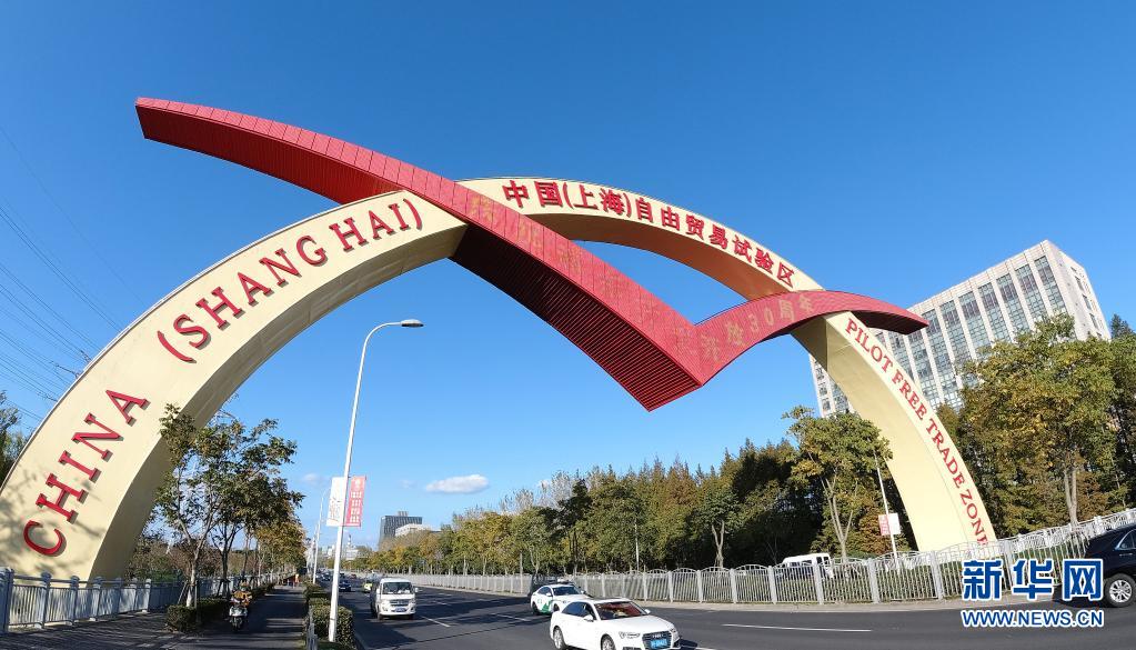位于上海浦东新区杨高北路上的中国(上海)自由贸易试验区标志门(2020年11月11日摄)。新华社记者 方喆 摄